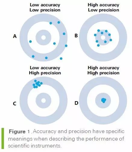 從上圖中可看出,Accuracy“準確度”是表示測量值和真實值之間有多接近,是用戶所第一重視儀器準確性的表征;而Precision“精度”指的是測量的重復性,即每次測量是否得到相同的值,但該值是否接近真實值就不一定了。例如上圖中不難看出圖D是性能最佳,準確度和精度都是最好,圖A是最差的。但是圖B和圖C相比較,哪一臺儀器測量的更加準確呢?當然是圖B,更接近靶心;但是如果不理解precision和Accuracy的區別,僅僅根據precision的數值比較,則很有可能得出的結論是圖C,因為圖C的點看似更為“密集”,precision好,但是得到的結果和真實值卻相去甚遠,換句話說,該儀器測量的值重復性好,但是測出的數據是錯的!!!