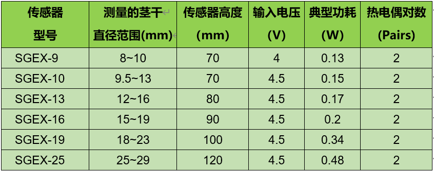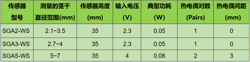 可測(cè)量直徑范圍在2.1~7mm之間的莖干,適用于莖干粗細(xì)比較均勻的植物,測(cè)量時(shí)需要將整個(gè)傳感器包裹在植物莖干上。型號(hào)如下: