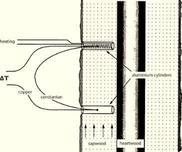 TDP探針傳感器利用Granier熱擴(kuò)散原理,把2根熱電偶探針直接插入樹木的邊材,上面的探針包含1個(gè)電加 熱器,下面的探針作為參照,測(cè)量加熱探針和參照探針之間的溫差dT。根據(jù)dT和零莖流時(shí)的dTm,應(yīng)用Granier模型,測(cè)得單位時(shí)間內(nèi)的莖流速率,再結(jié)合邊材面積獲得莖流通量。